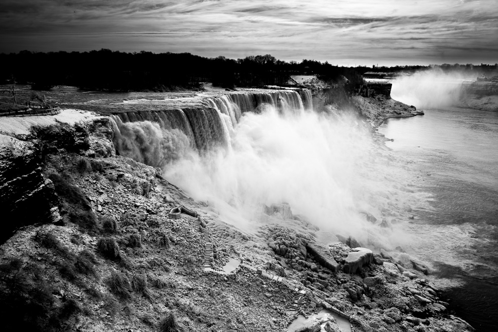 ▲ナイアガラの滝にて。手持ちで撮っているが、細部までシャープだ。Lightroomでモノクロに変換、調整して現像している。(クリックで拡大)
