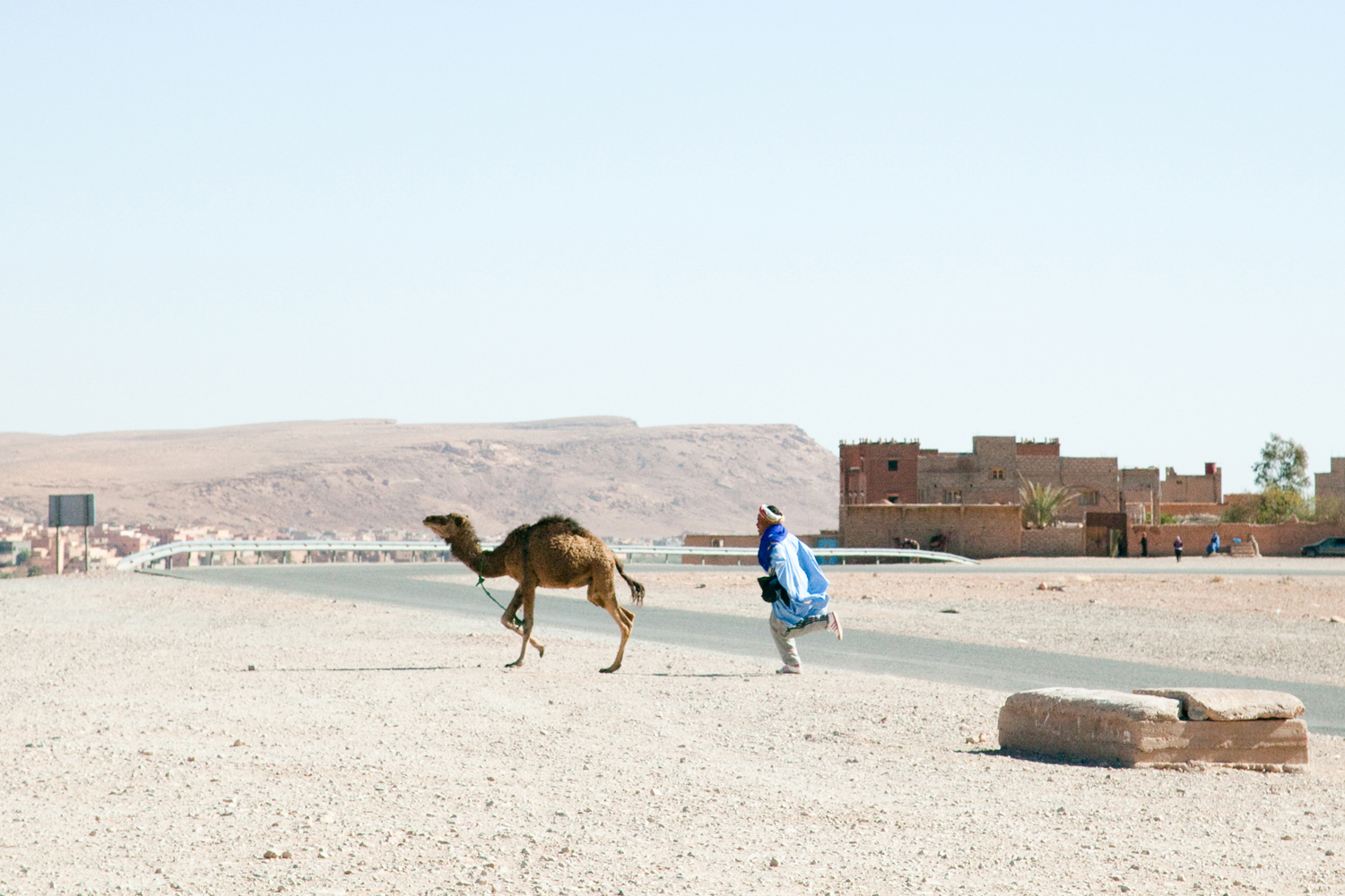 ▲モロッコ、ワルザザード。砂漠へ向かう道中に発見した逃げ出すラクダ。