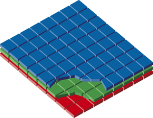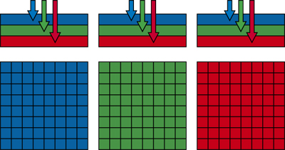 ▲FoveonのX3ダイレクトイメージセンサーは3層の感色層を持つことで、RGB3色の色情報をそれぞれ100%取り込むことができる