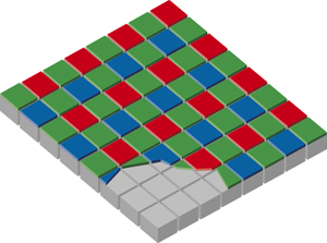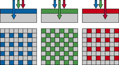 ▲従来方式のベイヤー式イメージセンサーでは、1面にRGBセンサーを配置しているため、得られる色情報はR25%、G50%、B25%となっている