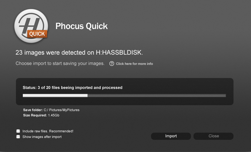 飯田:アマチュアはCFカードで撮られますけど、いちいちファイルを転送するのは面倒だという方に対しては、そのままダイレクトにCFカードリーダーを差すと、Phocus Quickの画面が立ち上がって、あとはDNGかJPEGか何にしますかと聞いてきます。これだけでコピーをしながら現像してくれるんですね。