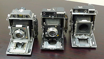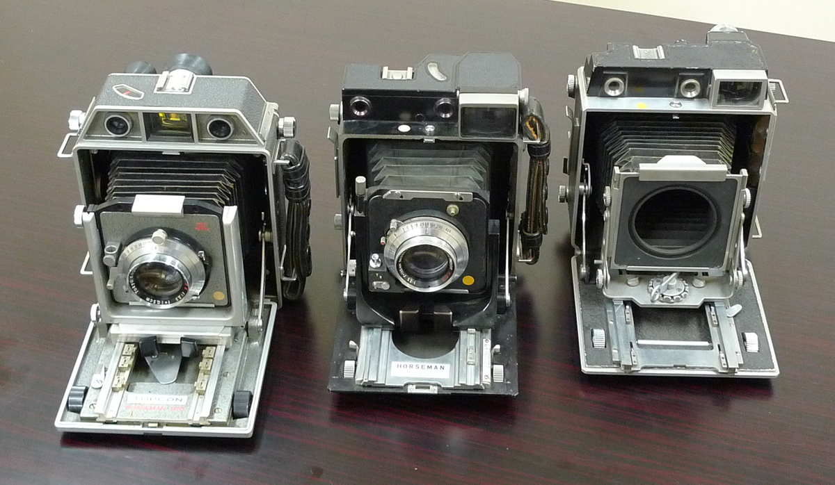 ▲1960年代の初期に製造されたホースマン。左から「トプコンホースマン970」「ホースマンプレス」「ホースマンプレス試作機」(クリックで拡大)