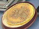 ▲話を聞いた駒村商会の駒村利之社長。手前の家紋は、海外進出当時に知り合ったエアフランスの機長の住むピレネー山脈カタロニア地方の家紋で、ホースマンのロゴはこれをアレンジしたという