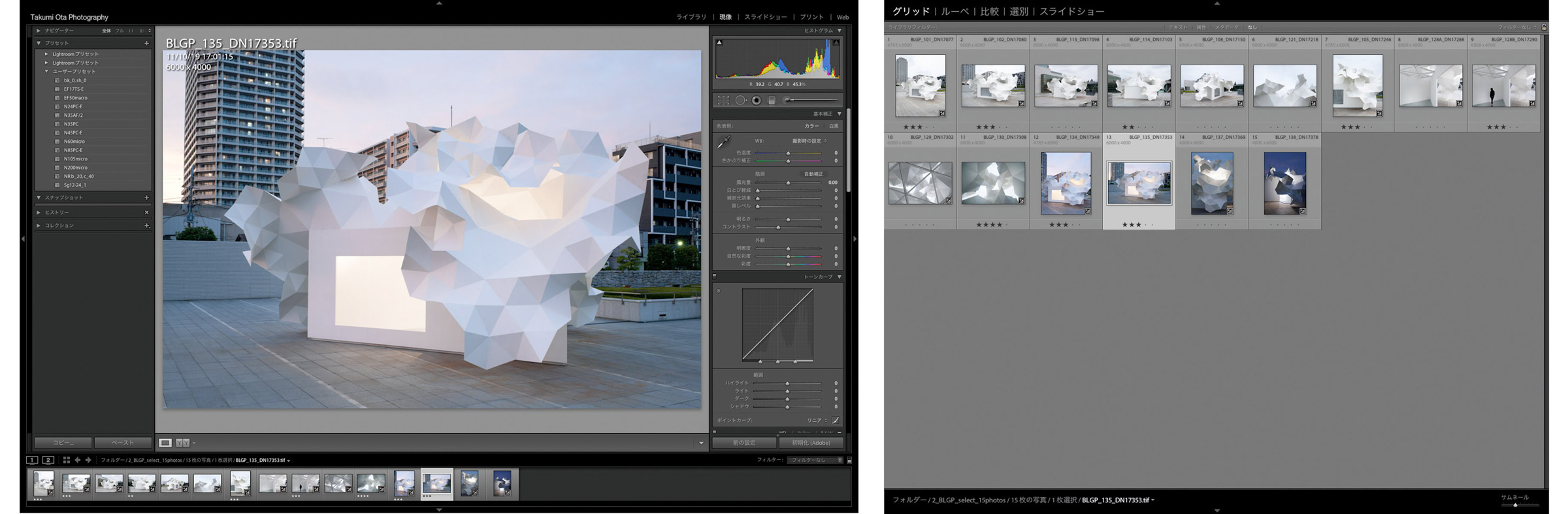 ▲Lightroomによる編集作業。画面は 東京都現代美術館ブルームバーグパビリオン(平田晃久氏設計)(クリックで拡大)