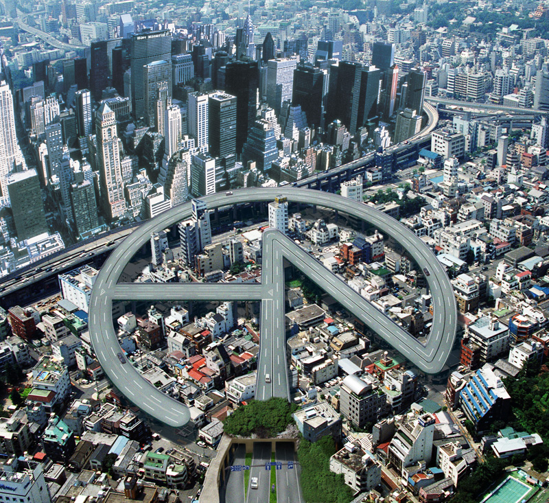 ▲詳伝社「BOON」(2001年)。空撮写真3枚で合成。ただし写真はすべて借り物。高速道路はCGやAdobe Illustatorで描画。写真撮影なしで制作した作品(クリックで拡大)