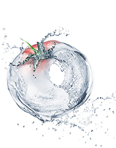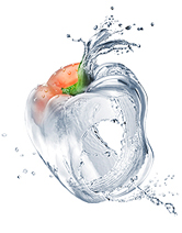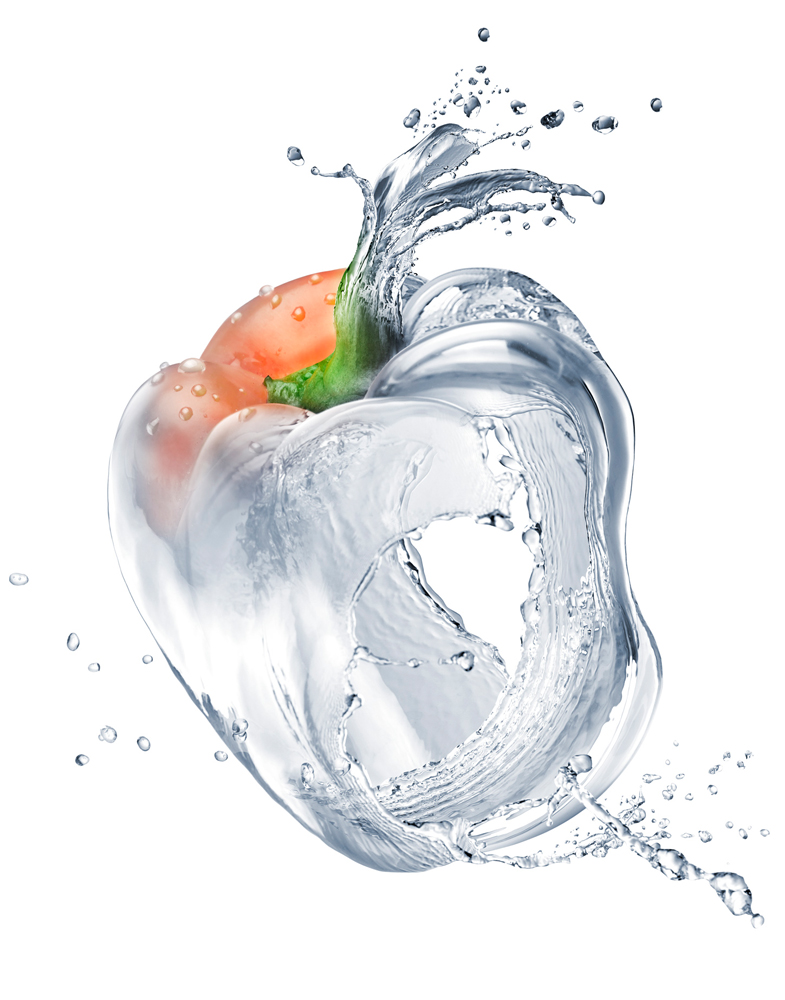酒匂:これは全部合成で作ってるんですよ。まずパプリカを用意して、角度を決めてパプリカを撮ります。そうすると、そのパプリカのイメージが頭に入るので今度は水を撮っていきます。水を撮るときはものすごくアナログなんですよ。水を投げて撮るだけなんです。200回、300回と水を投げるんです。水はいろいろな投げ方をすると、いろいろなラインができるんですね。そこからパプリカの形になるものを選びます。コップを逆さに水に沈めてひっくり返したり、水の表情のいろいろな出し方もずいぶん覚えました。
