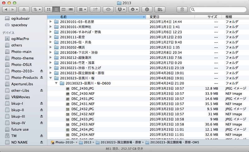 プロジェクト単位で完結すればともかく、あとから「どこどこの写真が欲しい」とか「いつごろどこでとったあれが欲しい」となると、探さなきゃいけない。フォルダ単位で管理してると、このあたりだなとあたりをつけたら行ったり来たりしながら探さなきゃいけない。