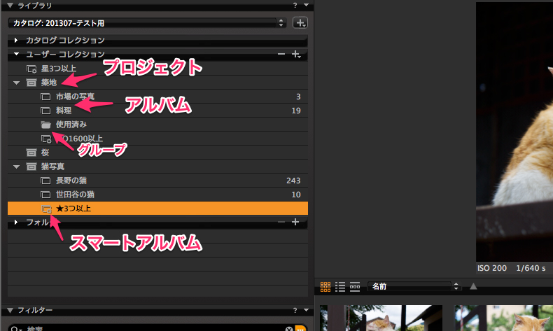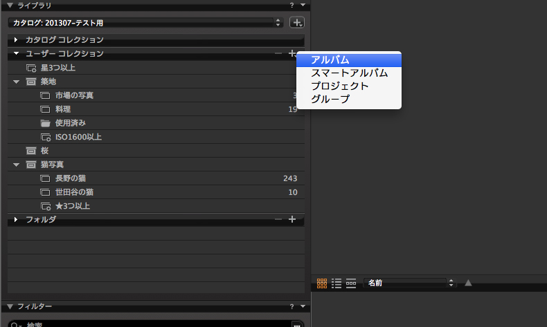 スマートアルバムやアルバムはプロジェクトを作成しなくても、ユーザーコレクションの下に直接置くことができるし、アルバムが増えてきたらグループを作ってまとめてやってもいい。