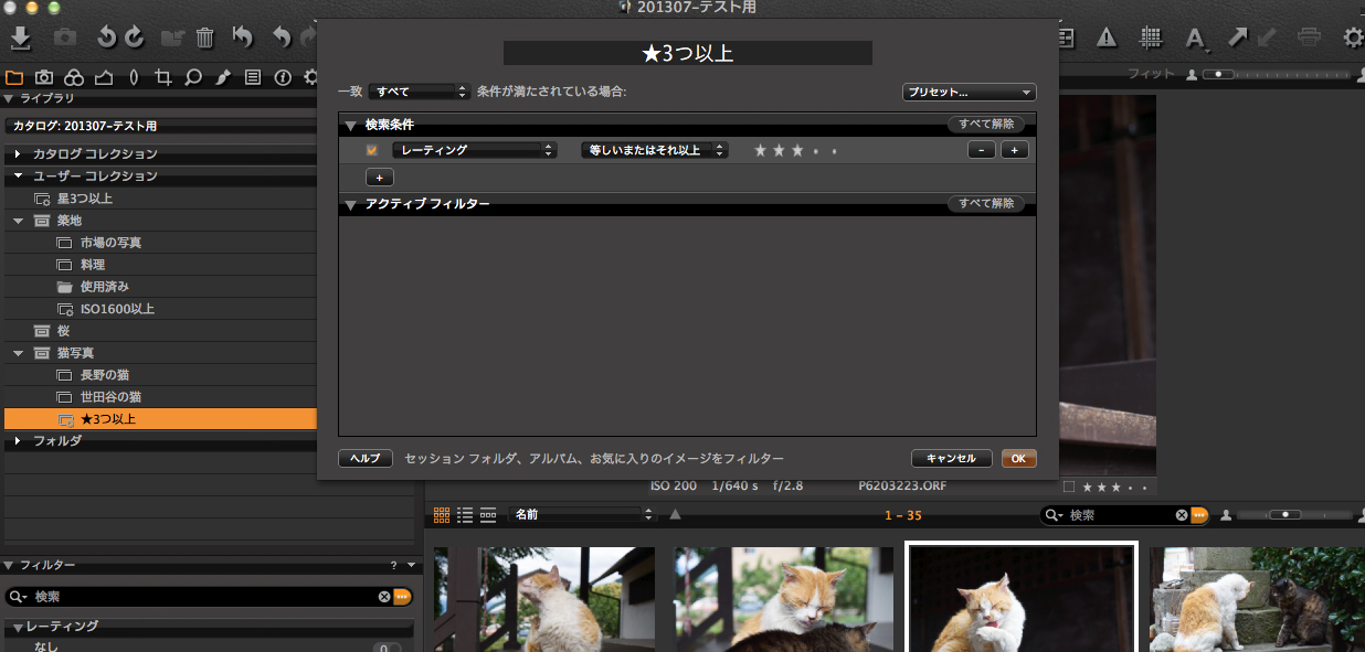 スマートアルバムというのは指定した検索条件に沿った写真だけを自動的にアルバムにしてくれる機能。「★3つ」以上の写真、というスマートアルバムを作っておけば、プロジェクト内の該当する写真だけがピックアップされる。