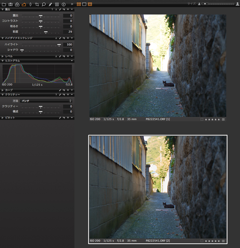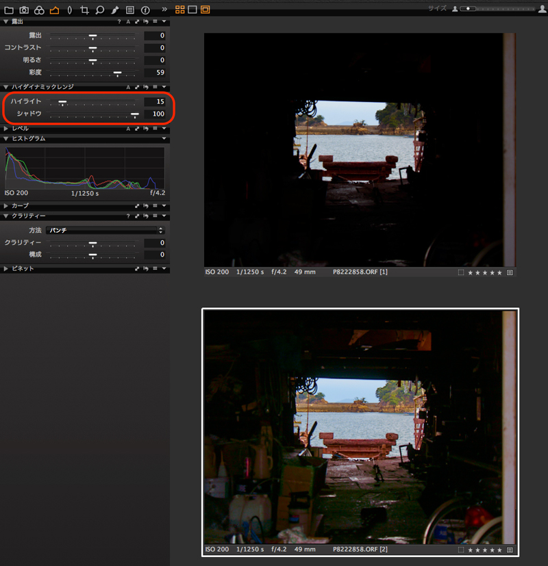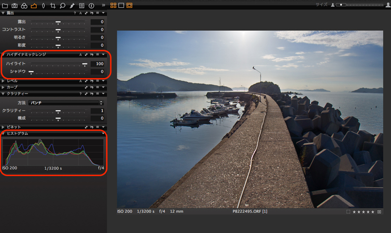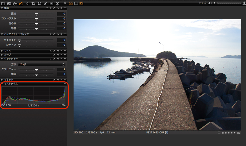 ▲ヒストグラムを見ると、ハイライト部がぐっと抑えられたのが分かる(クリックで拡大)(クリックで拡大)