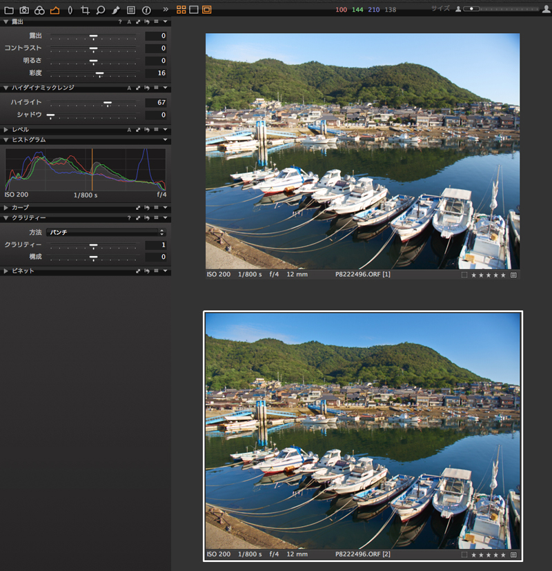 ▲コントラストが強い炎天下で撮ったカットは、「コントラスト」を調整して弱めるより、ハイライトやシャドウをそれぞれ調節した方がイメージ通りに仕上げやすい。順光で撮った小さな漁港の写真を例に。空の青さは多少明るさを抑えた方が色が濃く出る。ハイライトを抑えて彩度をちょっと上げてやるだけで印象がずいぶん変わるのだ(クリックで拡大)