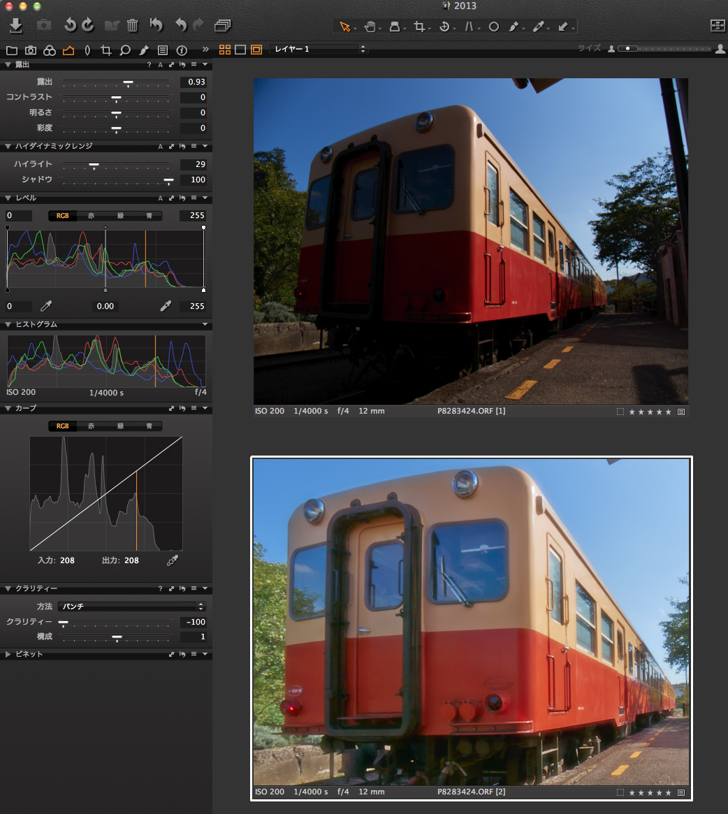 これだけ変わるのである。最初にレンズ補正をかけて色収差やディストーションをとったら、次は「露出」ツールを使う。