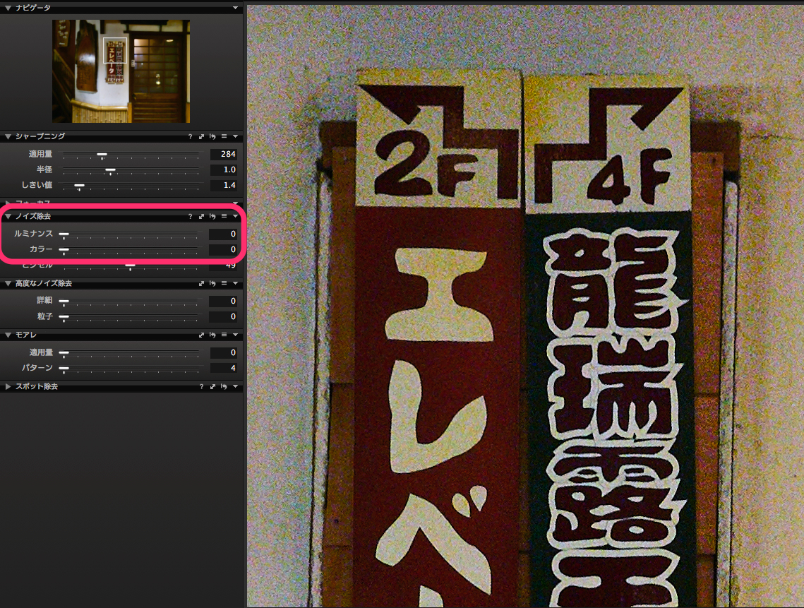 ここからコントロールしてみる。ノイズには一般に「輝度ノイズ」と「色ノイズ」の2種類がある。輝度ノイズというのは写真のピクセルごとに輝度(まあ、明るさ)のバラツキがどんどんランダムに出てくること。