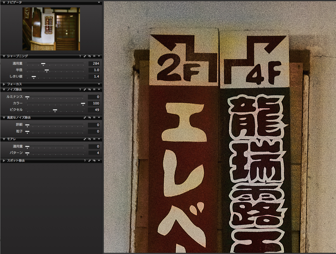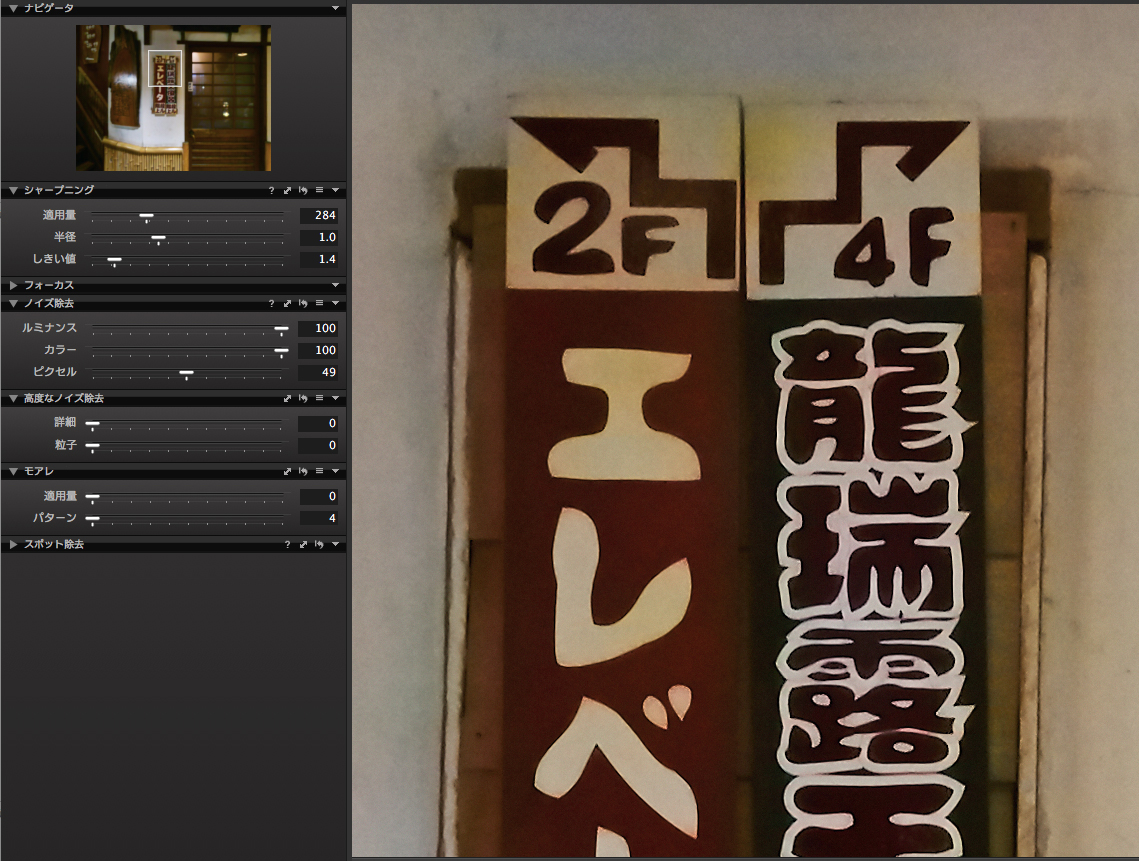 そうするとざらつきは減ったけど、不自然な偽色は残ってる。思い切って全部最強にしてみる。