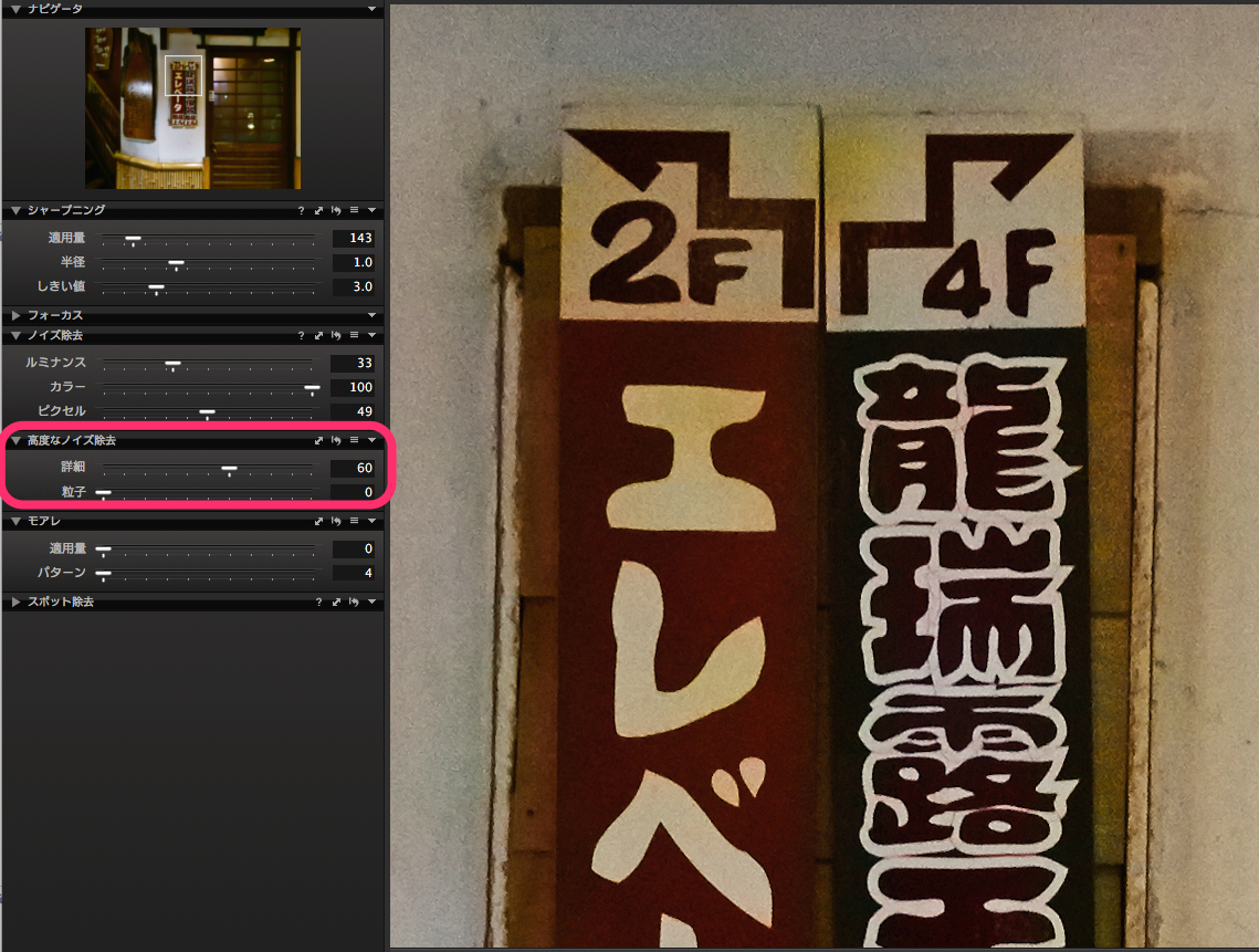 ノイズ処理の基本方針が決まったら、最後はディテールの描写をコントロールする。「高度なノイズ除去」で「詳細」を強調すると、ノイズ除去で失われやすいディテールを復活させてくれるが、強くかけすぎるとノイジーになる。「粒子」は逆に粒子感を出す処理で、ほどよくざらついた感じにしたいときにいい。