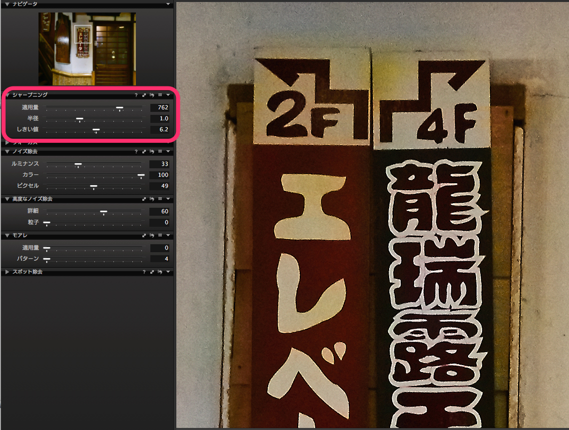 もう1つ「シャープニング」の調整も大切だ。これはエッジをシャープにするもの。「しきい値」(閾値)はエッジかどうかを判断する基準を変えるもの。これを下げると全体がシャープになり(ノイズも強調される)、これを上げるとシャープネスがかかるところとかからないところが出てくる。