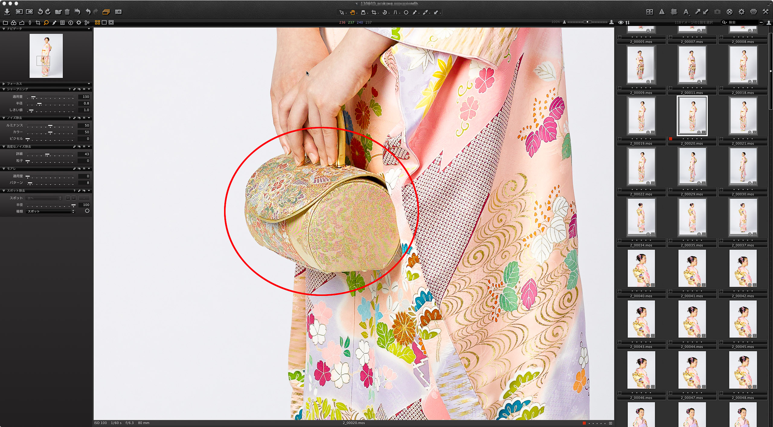 これは成人式の着物撮影です。バッグ部分にパターンモアレが出てしまいました。このカット以外でも、お父様の背広に少し、それと、お母様の着物の一部にモアレが出てしまいました。
