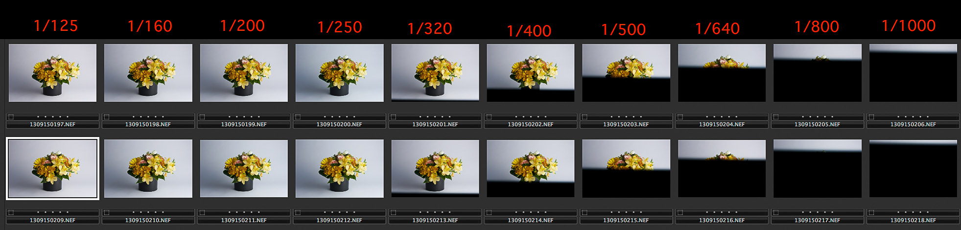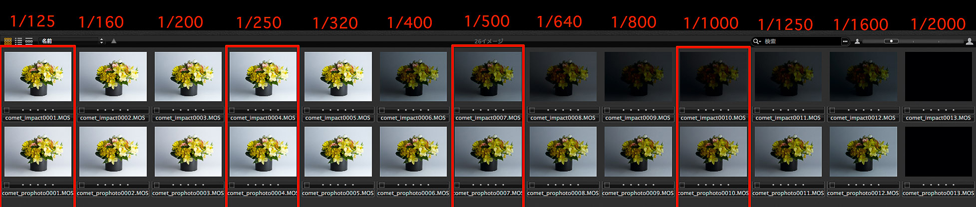 クリックで拡大 ●テスト3 最後に一般的なカメラとしてニコンD800によるテストです。上の段はシンクロ装置はProPhotoAirシンクロ、下の段は一般的な無線シンクロ装置を使っています。これはメーカーの推奨通り、ストロボは1/250sec以下でしか使えません。 [1] [2] [3]
