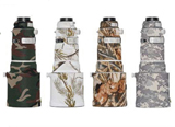 「レンズコート キヤノンEF 300mm F2.8L IS II USM用」(写真上)16,800円~18,900円(税込)。キヤノンEF300mm F2.8L IS II専用のレンズ鏡筒およびレンズフードの保護カバー。レンズの取り回しにおける使用感を損なわない約2mm厚の薄手のネオプレーン生地を使用し、裏には滑り止め加工が施されている。イメージスタビライザーやオートフォーカスのスイッチ部分はクリア素材が縫い付けられて、その設定状態が分かるようになっている。カメラボディに一番近い側に貼るカバーの根本に小さな切り欠きが設けられ、レンズの着脱時にマウントの赤いマーキングがよく見えるように考慮されている。通常の迷彩や冬季迷彩など4色(色によって価格が異なる)。