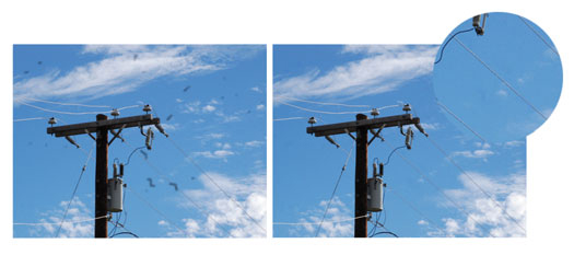 画像の汚れを上から塗りつぶすのではなく、汚れの下に隠れている情報を読み取り、浮かび上がらせることによって汚れを取り去るので、電線などの非常に細かい被写体にかかった汚れでも問題なく処理を行う。