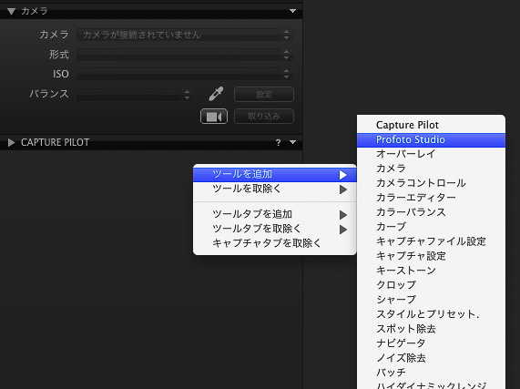 プラグインは「Profoto Studio」という名前なので、C1のツールウィンドウから右クリック、ツールを追加>Profoto Studio を選択する。