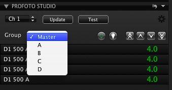 ◀各ストロボの出力調整はグループ選択をされたものが変わる。