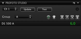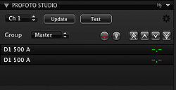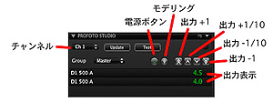 ◀ツールの各操作は左のようになっている。アップデートで認識されれば、電源ボタンをクリックするだけで、すべてのストロボが電源オンになる。
