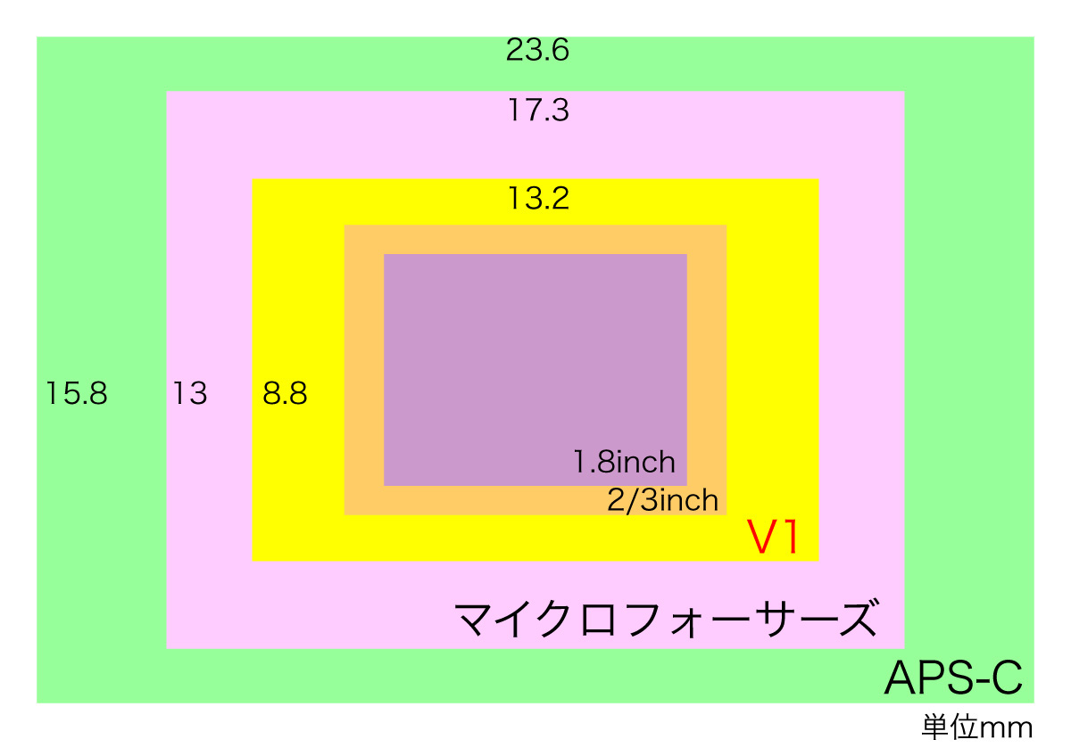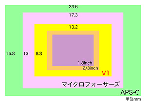 ◀V1のセンサーは一般コンパクトよりも大きいが、先行するマイクロフォーサーズやAPS-Cと比較すると小さい。撮影画角はレンズ焦点距離の2.7倍に相当する。35ミリ換算の50ミリ(いわゆる標準レンズ)は、V1では18ミリになる。この計算が意外とめんどくさい。