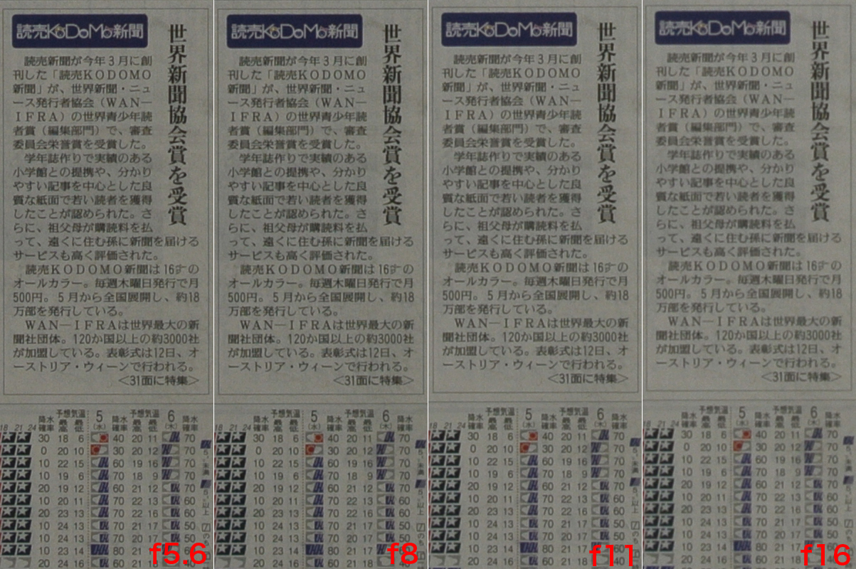 ○30mm(80mm相当)による絞りによる画質変化(新聞紙センター部分)