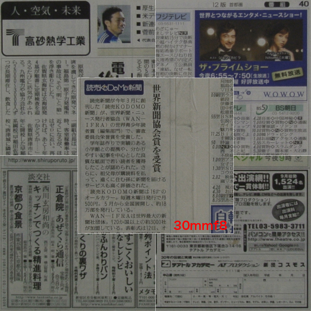 センサーが小さいので気になるのは画質。今回は専用の「NIKKOR VR 10-30mmf3.5-5.6」でテストしてみた。テストは普通の新聞紙の見開きを、30mm(35ミリ換算80mm相当)で撮影した。