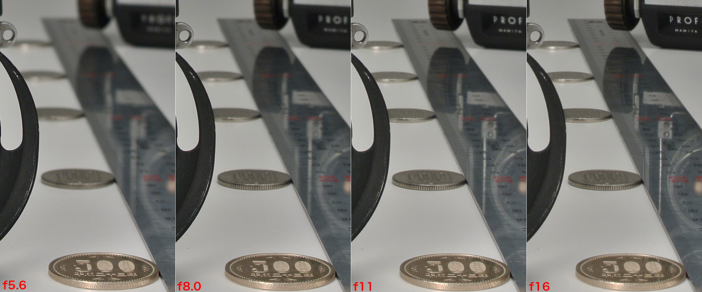 作例を見ると、絞ることにより、ピントが奥まで合っていくのが分かる。f16で40cm近辺までピントが合っている。こ れをフルサイズや中判でやろうとするとなかなかできずに苦労する。仕事では最近はピントをずらして数枚撮影し合成している。絞ると画質の低下があるが、Webなどの利用では問題ないレベル。ボケは素直で綺麗な感じがする。