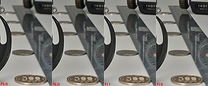 カメラは絞ると解像度が低下する。V1も同じように絞ると画質が低下する。f5.6、f8辺りが良く、f11から 画質の低下が見られる。絞って使うのはあまり良くない(よっぽどのことがない限りこのカメラで絞ることはな いと思うが)。しかし、デジタルカメラ全体の問題で、一眼レフ等、仕事で撮影しているとどうしても絞らざるを得ない時があり、悩ましい問題でもある。10mm(27mm相当)、18mm(50mm相当)でも似たような結果で、開放から1絞り絞ったぐらいで良好な画像が得られる。