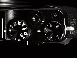 ▲X10の上部にはシンプルにモードダイヤルと露出補正ダイアル、シャッターボタン、ファンクションボタンが並ぶ。ダイアル式は直感的で使いやすい。(クリックで拡大)