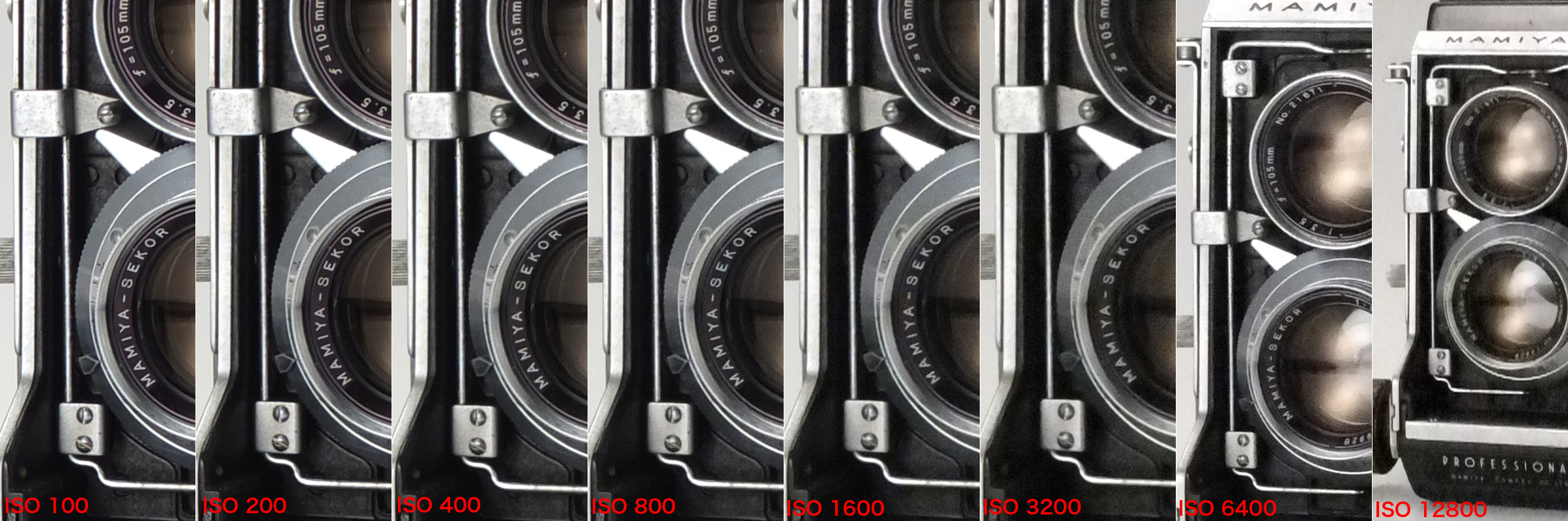 ◀ISO100~1600までは十分に使用できる。ISO3200でも大きくならないなら大丈夫だろう。ISO6400で画像サイズはMサイズ(約500万画素)、ISO12400でSサイズ(270万画素)になり、RAWは使用できなくなる。(クリックで拡大)