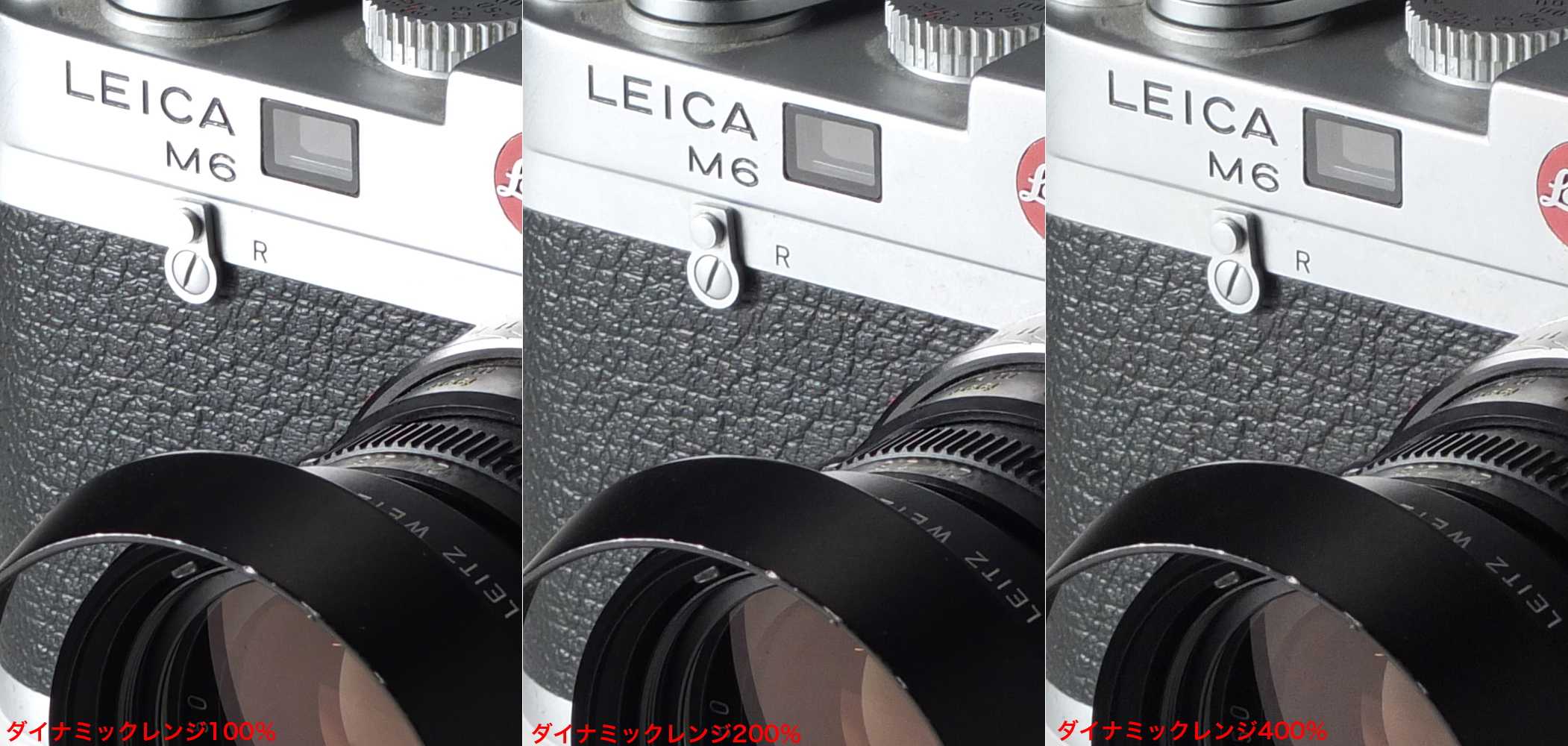 ◀ダイナミックレンジ100%に比べると200%、400%は白とびが押さえられているのが分かる。しかし200%の場合はISO200から、400%はISO400からしか使えない。