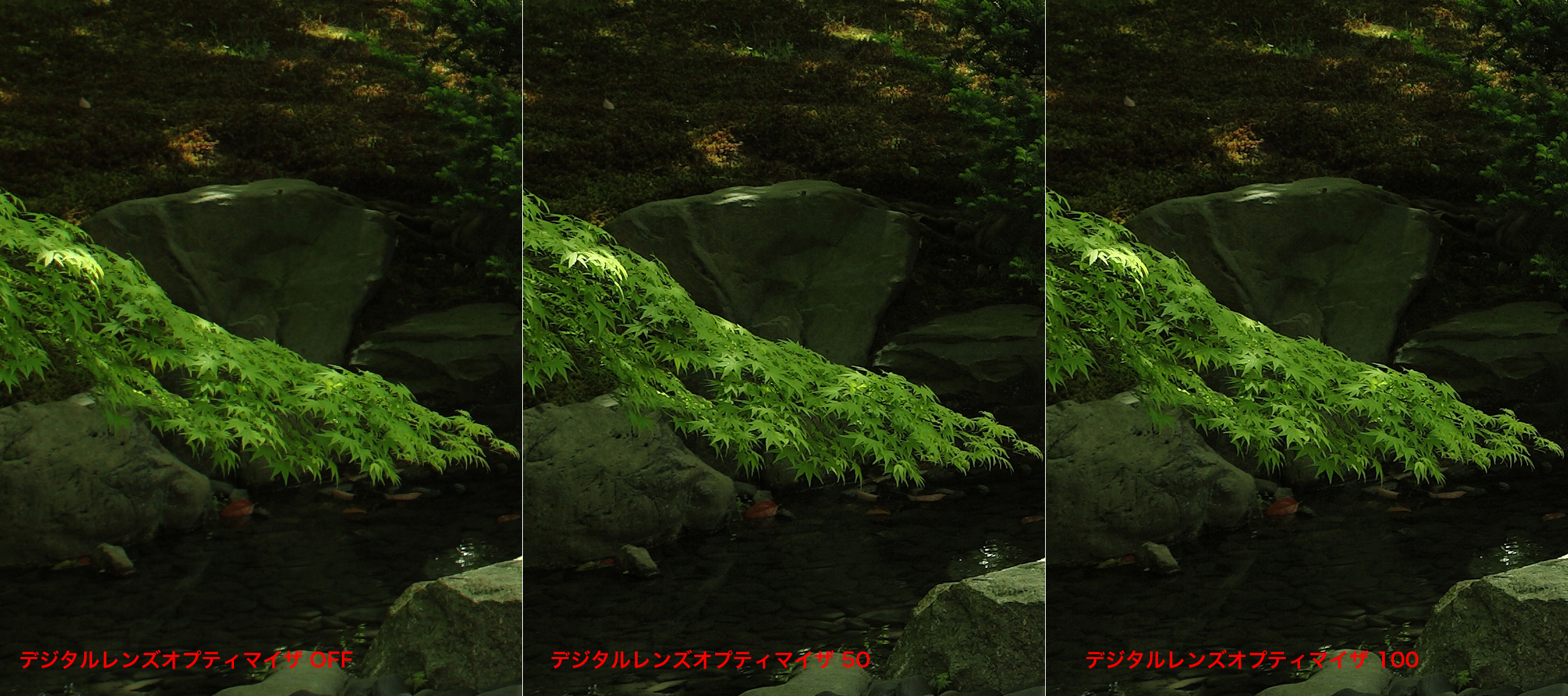 比較してみると、デジタルレンズオプティマイザ機能を使用すると、よりシャープに、また、解像感が若干ではあるが、向上している。