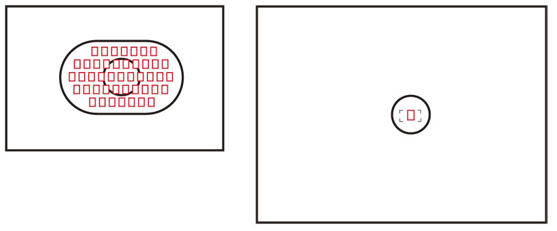 ◀合計45点のAFフレームを持つEOS–1Ds Mark IIIの例(左)とハッセルブラッドのAFフレームの例(右)(クリックで拡大) |