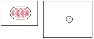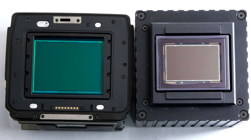 | ▲一般的な35mm判のデジタル一眼レフカメラが採用する36×24mmセンサーのサイズの例(右)と、一般的な中判デジタルが採用する48×36mmのセンサーの例(左)(クリックで拡大) |