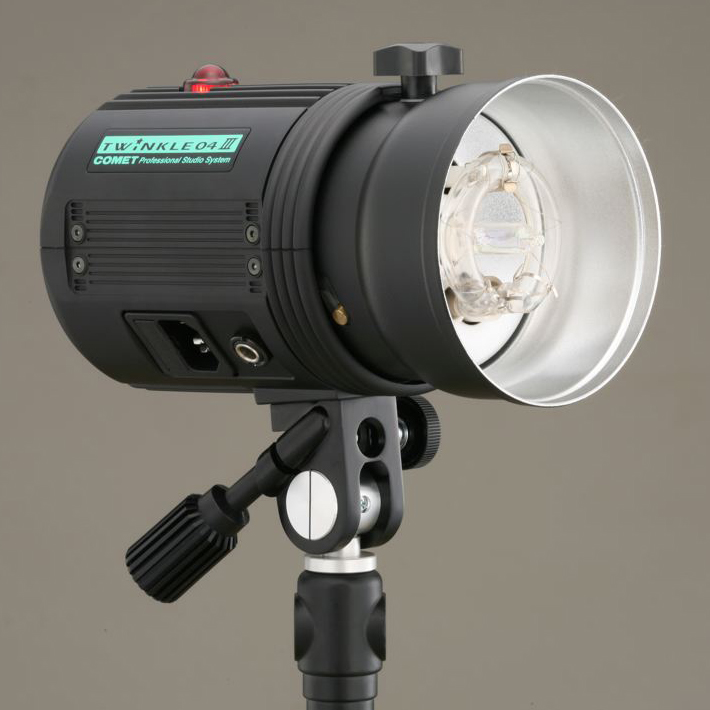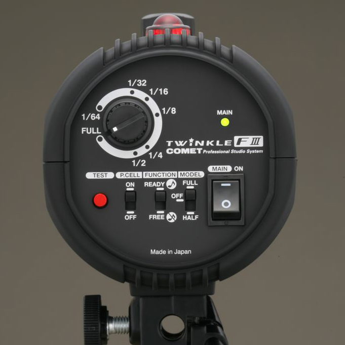 コメットのモノブロックストロボのブランド名は「TWINKLE」。最新モデルのFIII/IIIシリーズは2010年5月に発売されたばかりで、特徴は各モデルで1.2kg~1.5kg台と軽量で小型であること。200Ws、300Ws、400Wsの3モデルに、各モデル「冷却ファンあり」と「冷却ファンなし」の合計6機種がラインナップされている。
