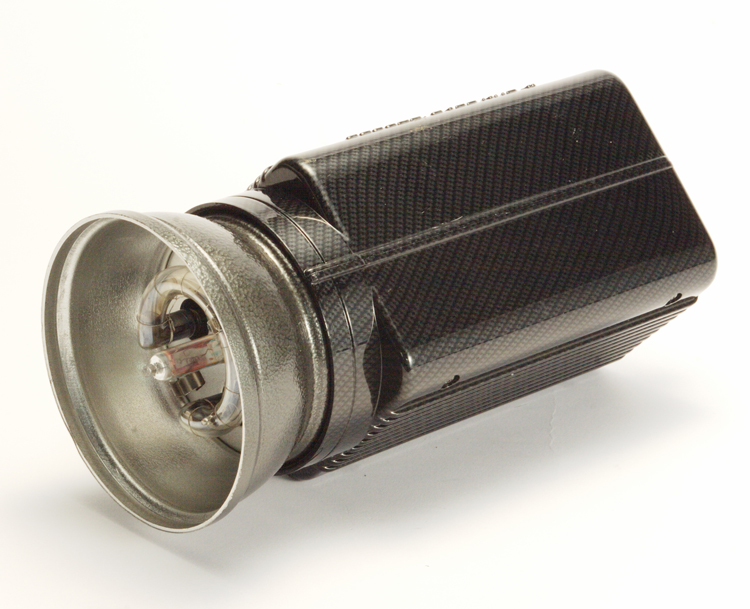 ▲カーボン調にデザインされたボディ。ストロボでは面白い試みだ