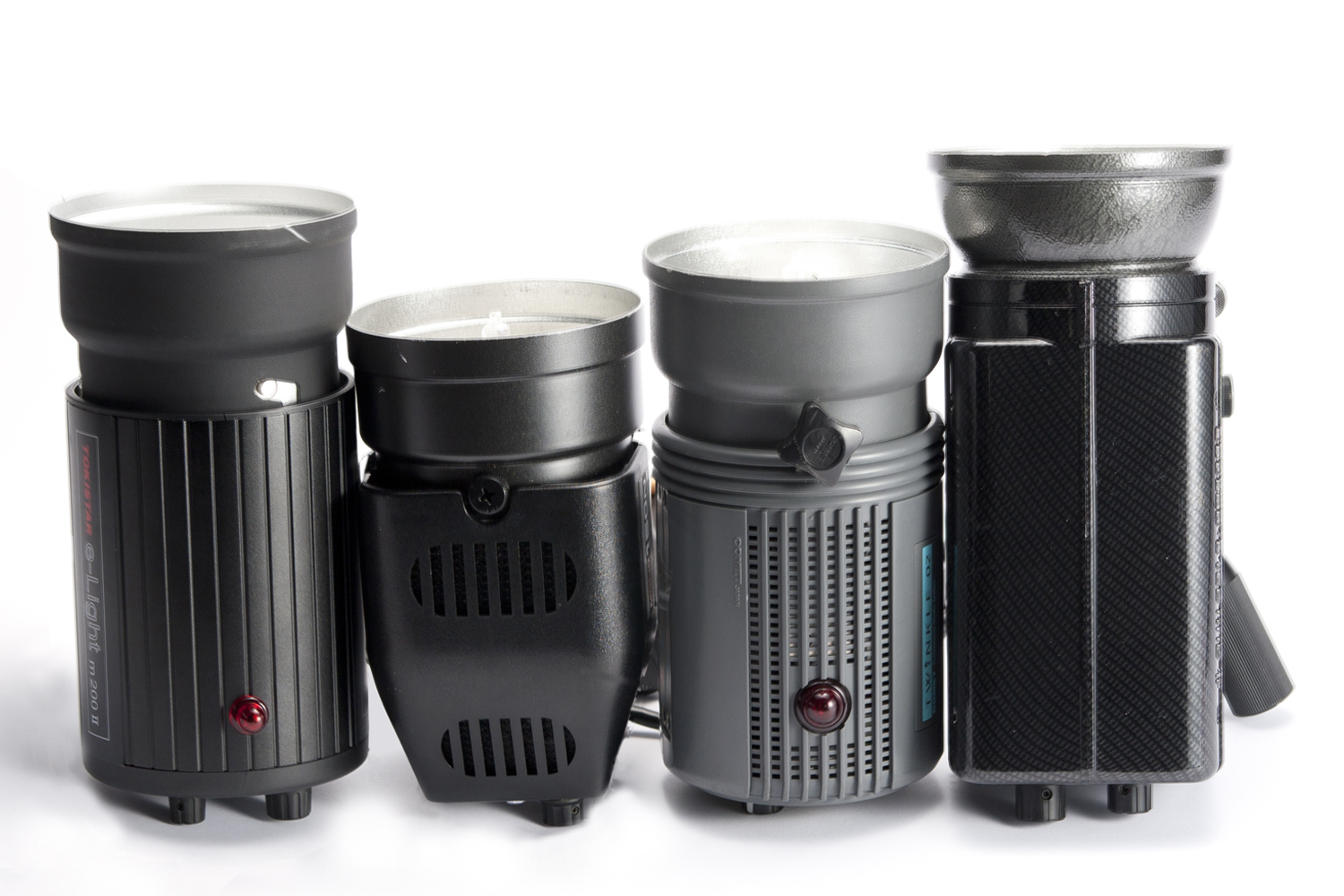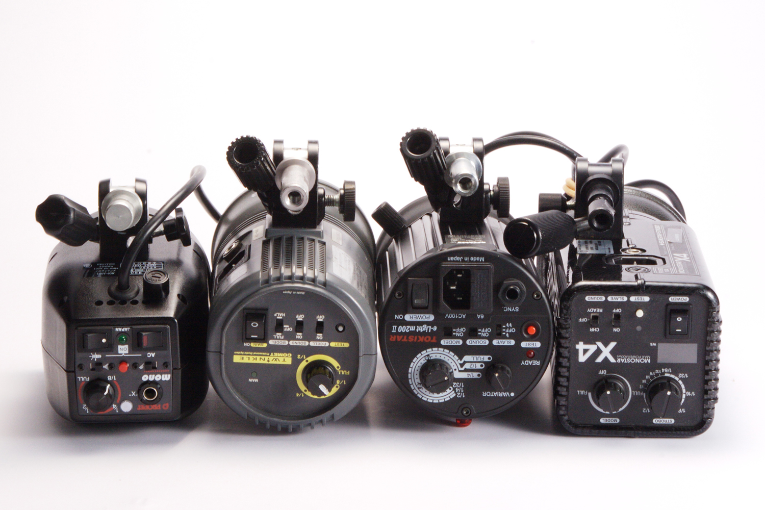 ◀左からプロペットmono150N、コメットTWINKLE 02、トキスターe-light m200 II、サンスターストロボMONOSTAR X4
