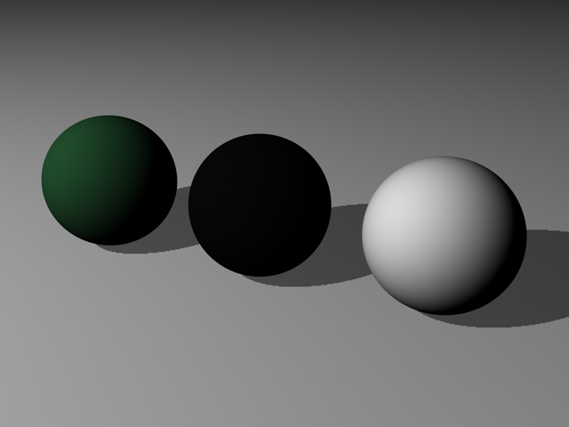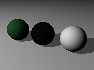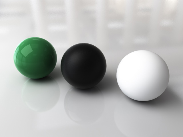 球体は、ワンクリックで呼び出せる形状の1つである、それをいくつか平面の上に配置しただけの簡単なシーンを用意した。そこへオブジェクトの色だけ設定、各種設定はデフォルトの状態、基本のライトを1つだけ設定し、レンダリングボタンを押した結果。この程度であれば、特に習熟していなくても1~2分ですべて設定が行え、レンダリングは1秒以下で完了する。しかし、現実感の乏しい、いわゆるCG臭い出力となる。3D CGソフトの多くは、計算時間を最小にするため、基本的な設定のままでは、このようなレンダリング出力結果となる。
