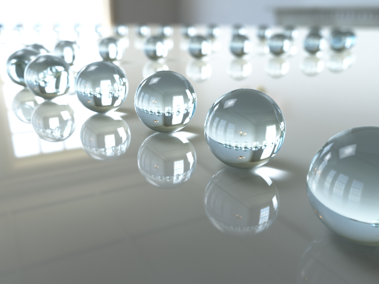 球体と平面と言うシンプルなオブジェクトだけでも、少々アレンジして、このような画像も比較的容易(あくまでもシーンの制作作業時間として)に作れる。3D CGでの制作において、形状が単純でシンプルであることは、何よりも優位になる要因となる。しかし、ガラスのような透明体は、レンダリング時間が掛かる質感の代表で、この画像は30分を要した。