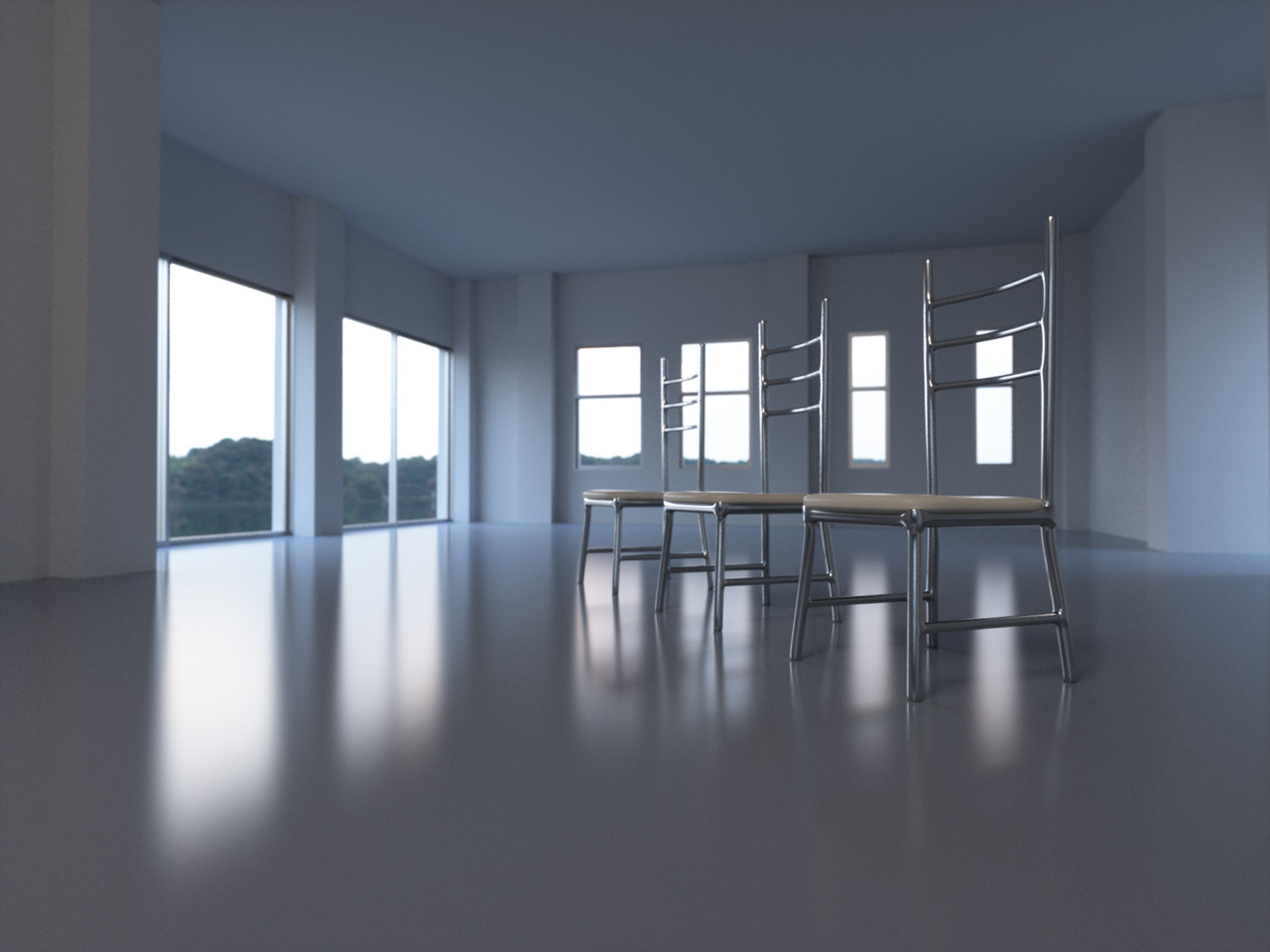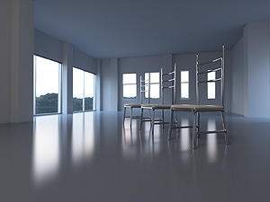 オブジェクト制作(モデリング)が、どの程度製作時間に影響するか? これはシンプルなインテリア室内シーン。単純な形状の組み合わせによるこの程度のシーンなら、1時間程度の作業で壁面や窓などの基本的な形状を作成することができる。