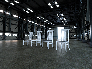 質感の設定(反射やそのボケ具合など)、ライティング(IBL・室内環境の画像を元にした環境光などによる照明)、レンダリング設定(GI・現実同様の複雑な光の振る舞いを再現する)などを、フォトリアルな出力が可能な設定に変更した。レンダリング時間は8cpuマシンで1分。形状は数秒で用意できる簡単なものであっても、質感設定・ライティング・レンダリング設定などにそれなりの設定を行わなくては、写真としてみられる実在感のある出力は得られない。その設定の多くは、少々複雑で、1つのスライダーで解決するような単純なものではない。
