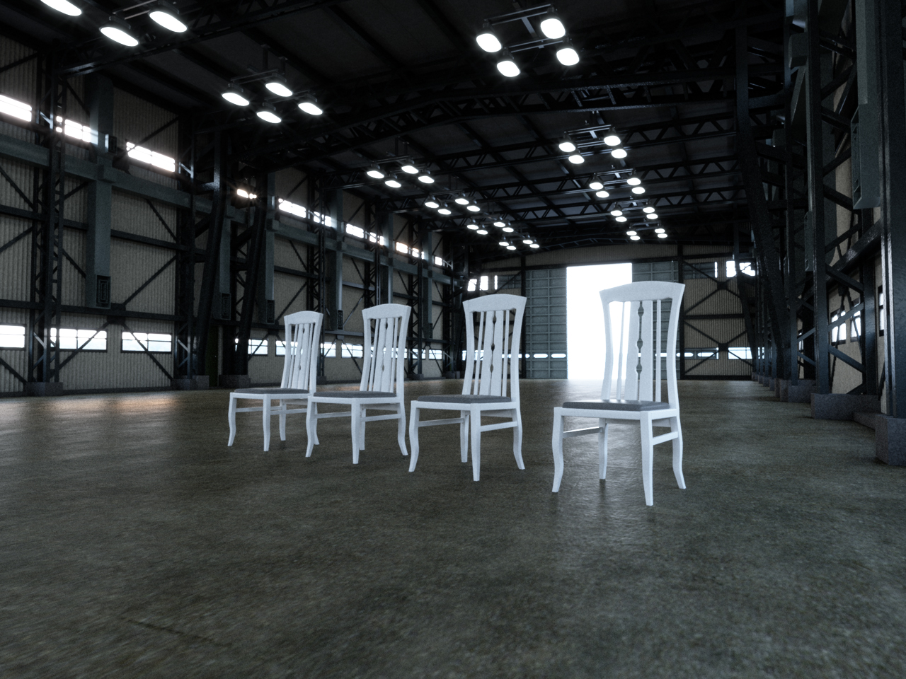 複雑な細部の構造を持つ倉庫のような空間。少々細かいところは省略しているが、モデリングと質感設定などで1週間程度の制作時間を要する。単純に部品点数に見合った作業時間が必要になるわけで、そのボリュームによる作業時間の変化は、このように桁が2つ以上変わってしまうことも珍しくない。