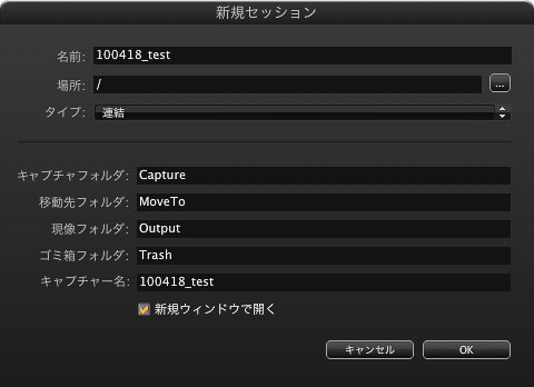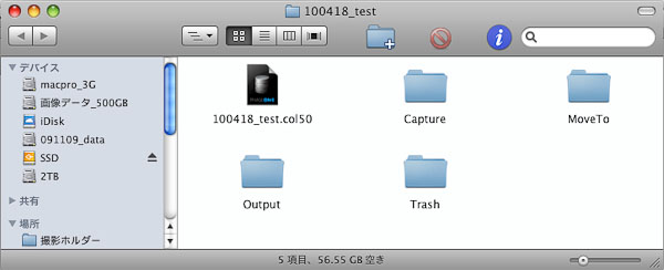その設定ファイルと、「Capture」、「Move To」、「Output」、「Trash」の4個のフォルダで、一つのセッションフォルダが構成される。 |