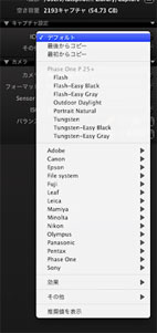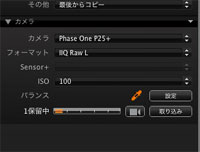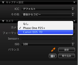この例だとPhase OneのP25+とキヤノンEOS7Dの2台が同時につながっている。このように複数台のカメラを同時に使うことが可能だ。ただし、同時に撮影できるわけではなく、ここで切り替えたカメラが使用可能になるという仕組みなので間違わないように。