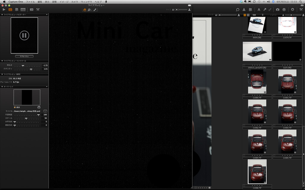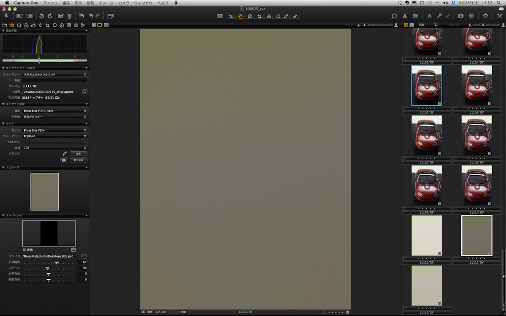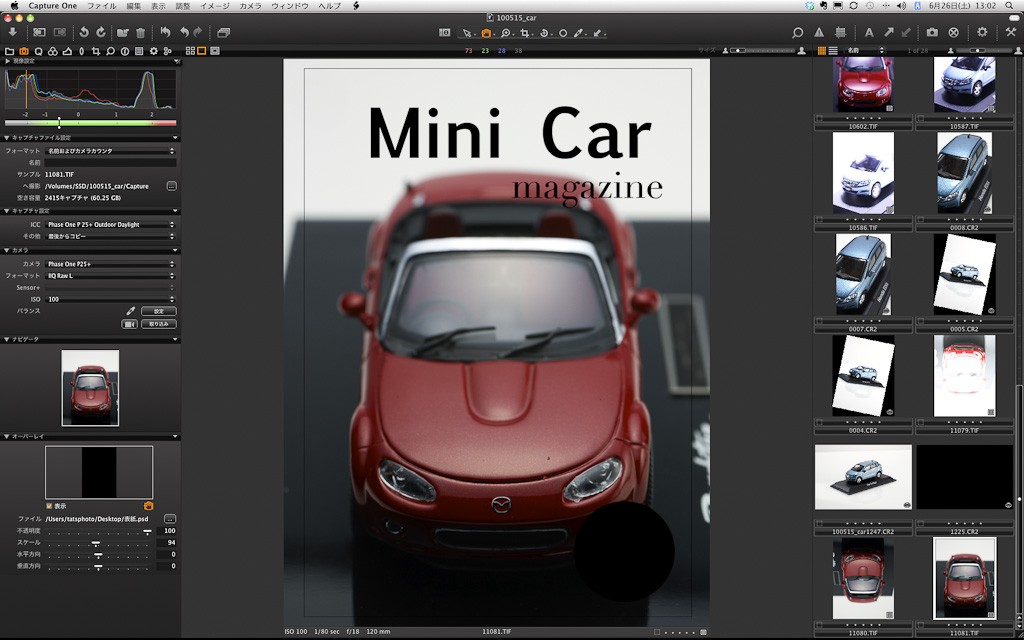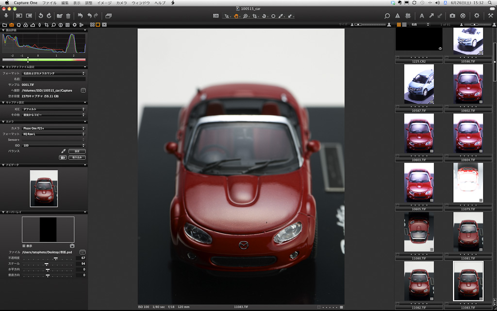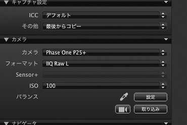 ◀C1Proを起動して、カメラをつないだところ。今回のカメラはPhase One 645 AF、デジタルバックはP25+。レンズはマミヤのマイクロ120mmを使った。