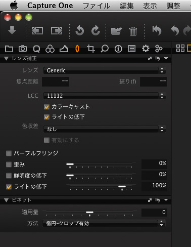 カラーキャストとライトの低下にチェックが入る。ライトの低下は周辺光量の低下を補正する。